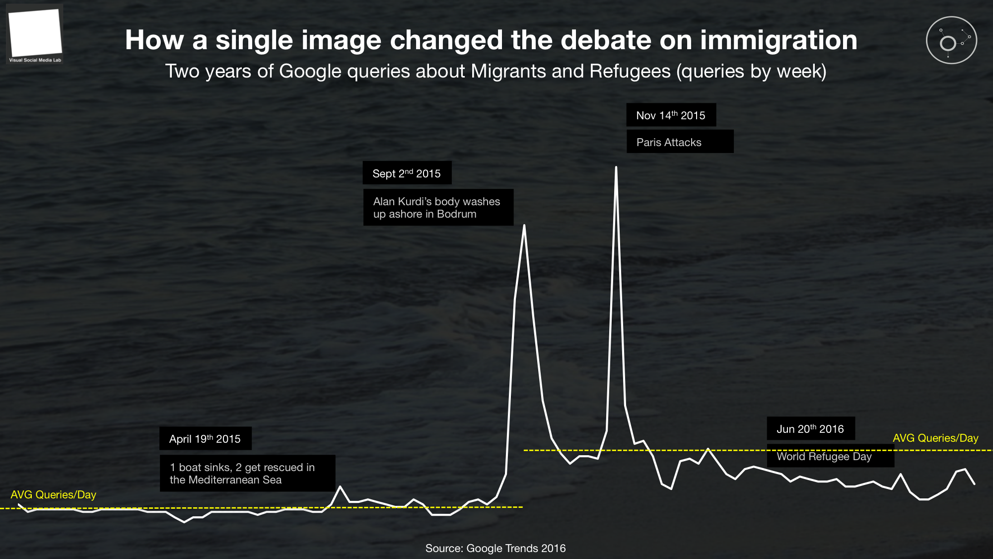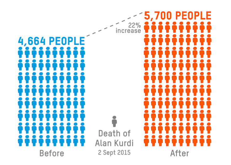 And when looking at search behaviour on Google Trends, we saw a huge 294% increase in the volumes of Google searches about the issue (combined 'refugee'/'migrant' queries) with correlating spikes along all the key events of the crisis over the 12 months following the death of Alan Kurdi.