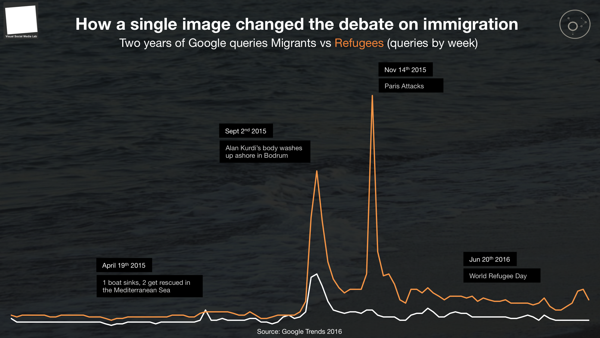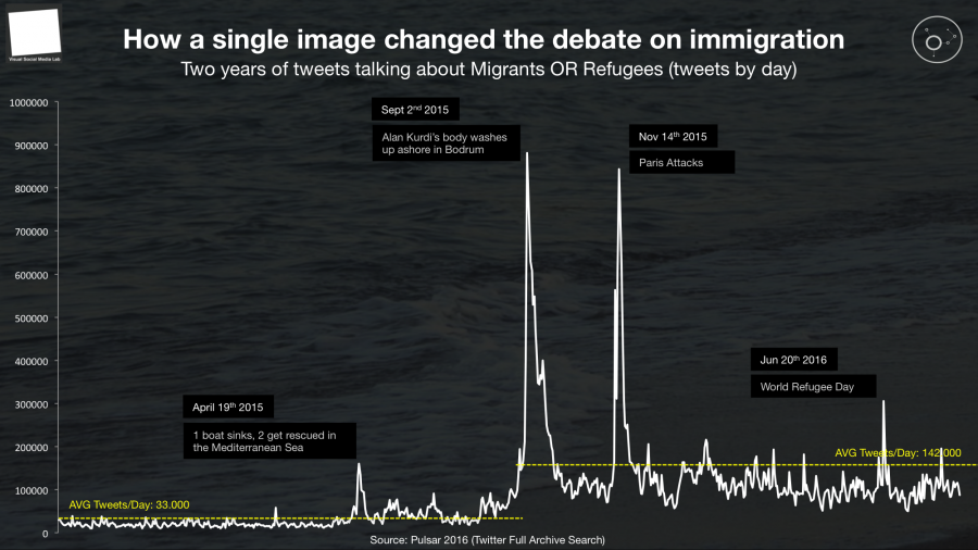 With the Visual Social Media Lab (VSML) we set out to study the impact of those pictures. One of the first things we noticed was that the people commenting on the story on Twitter and Facebook seemed to be using the word 'refugee' (rather than 'migrant') to describe what was happening a lot more often than before the tragedy. If that was the case, this could have been a signal for a significant shift of perception around the humanitarian crisis and migration in general.