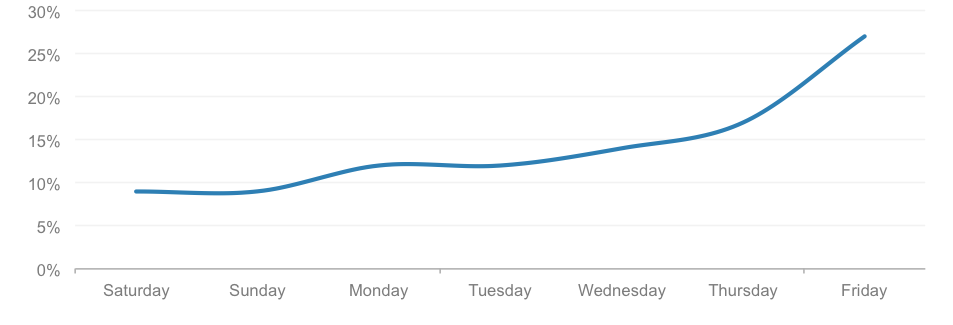 We tracked people talking about payday over a period of three months to see whether there was a correlation in volume of mentions at the end of the month. What we found, however, was that people were talking about payday at the end of every week. Yep, excitement about payday steadily builds to that (every) Friday feeling.
