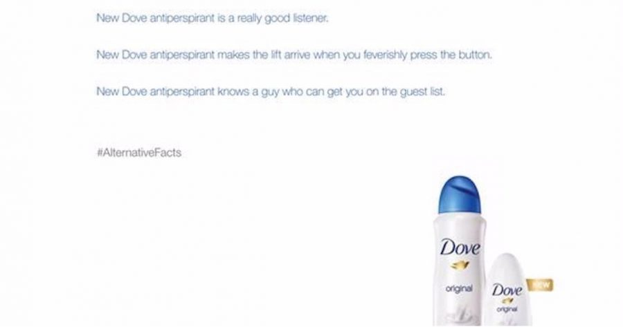 Rather than call them for what they really are - outrageous lies - one of the chief counselors to the newly inaugurated US president described his fibs as "alternative facts". While it certainly adds another dimension to the 2016 word of year "post-truth", it's not quite as elegant as the latter euphemism. But before it disappeared from the headlines, one brand decided to have some fun with it. The beauty brand Dove took out a two-page advert in the Guardian and the Times of London. On the left page there was a picture of a new Dove deodorant alongside blatantly false claims. Apparently the new Dove antiperspirant was first used by Cleopatra, it can increase your IQ by 40 points, and it can even plan your next holiday at a competitive rate. Then at the bottom of the page is a single hashtag - #AlternativeFacts. On the right page, Dove counters it's lies with one truth - its new deodorant cares for your underarm skin like never before. And the message is wrapped up with #RealFacts. The genius of the advert is it makes a powerful statement that's both politically and culturally relevant to today, but makes no mention of Trump or his advisor. The strength of the message lies in its subtlety – making it easy for those who know the meaning behind “AlternativeFacts” without alienating those who don’t.