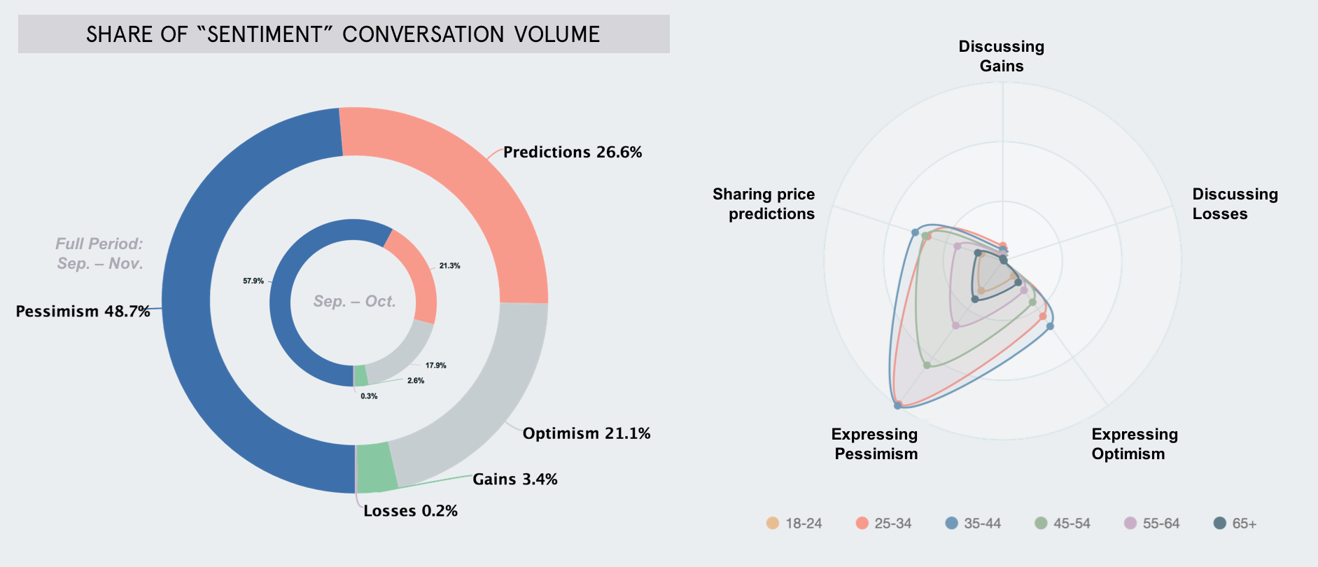 Sentiment tides are shifting as recent conversation shows less skepticism, more optimism. While pessimism still leads the emotional chatter around cryptocurrency, it seems opinions are changing course; since mid-October, pessimism has decreased by more than 10%, while optimism and predictions conversation have grown. The 35+ segment of the audience have driven this shift in perception, becoming notably more optimistic in the last month. This implies a turn away from the skepticism that’s often found in mainstream media conversation about Bitcoin.