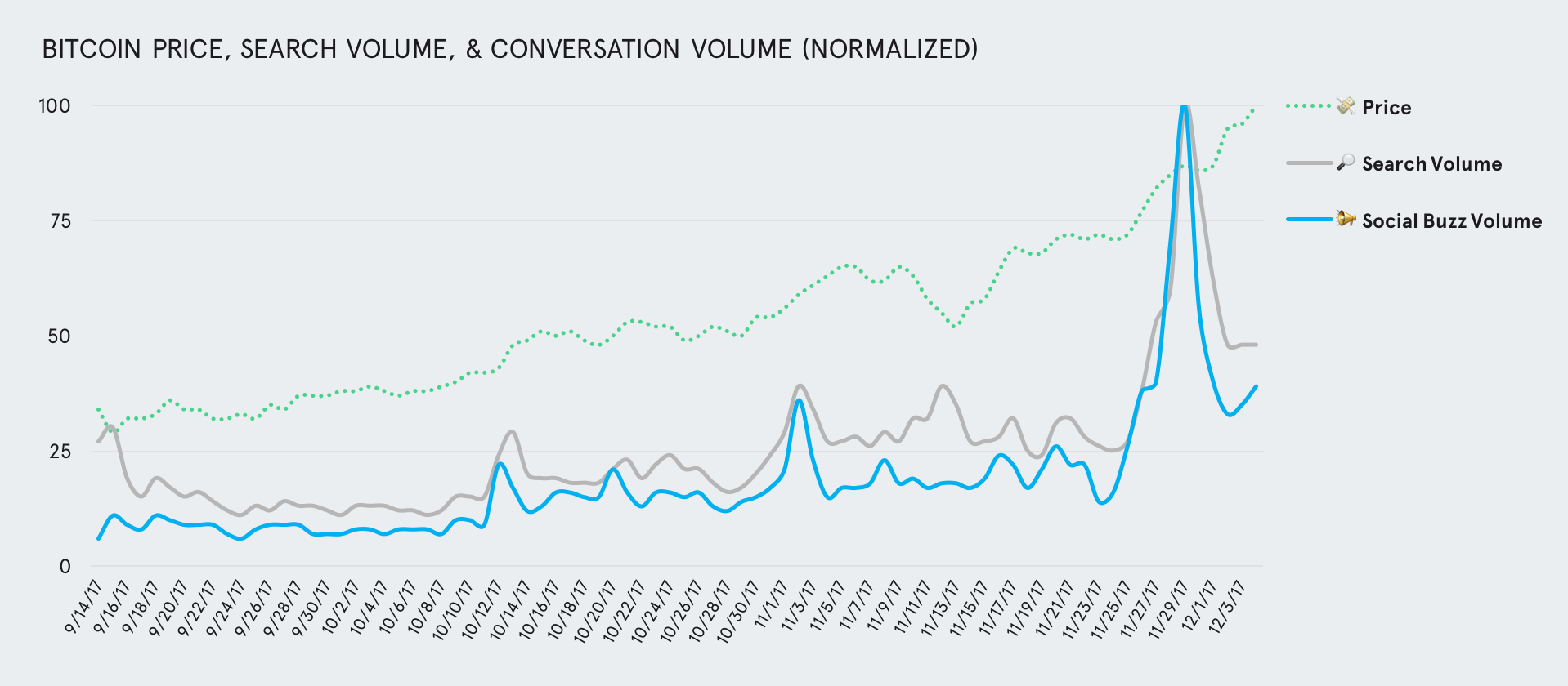 Patterns in social media conversation signal upcoming Bitcoin price movements. One might assume that online cryptocurrency conversation is mostly reactionary, trailing prominent media buzz - but social conversation actually seems to stimulate interest and action in the space. Spikes in conversation volume often precede spikes in search volume by one full day, and Bitcoin price peaks by one to three days. In nearly every case, a rise of 10% or more in social cryptocurrency buzz from one day to the next “predicts” a rise of at least 5% in the price of Bitcoin within three days time. And, over the full period measured, higher social conversation volumes are strongly correlated with higher Bitcoin price levels (r = .76).