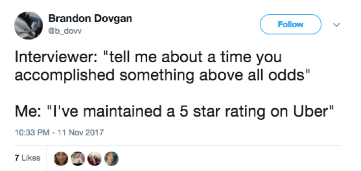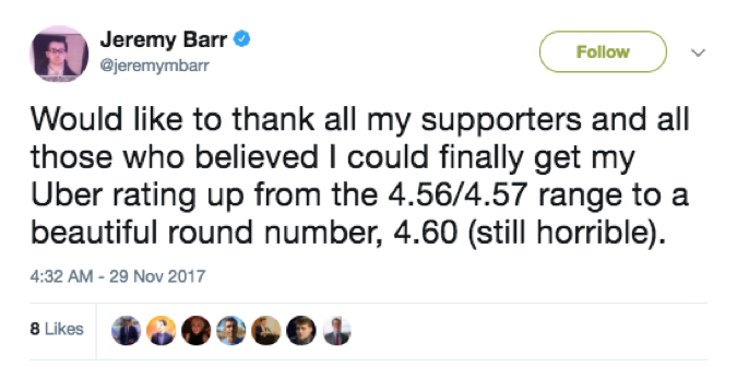 Of course, expressing of a sense of extreme pride for a high score, or being “devastated” about a low Uber rating might be largely exaggerated. However, the fact that these jokes are recurring and relatable confirms that many people see Uber ratings as - at least somewhat - a wider reflection on who we are, and can shake a sense of identity, even for a moment.
