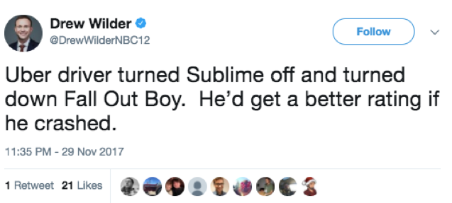 Being late or cancelling is cited as the biggest offense, followed by the debate around whether starting a conversation with the driver helps or hinders one’s score. Worries over being polite enough, tipping, eating in a car and being drunk, or simply “annoying” all feature within the conversation as well.