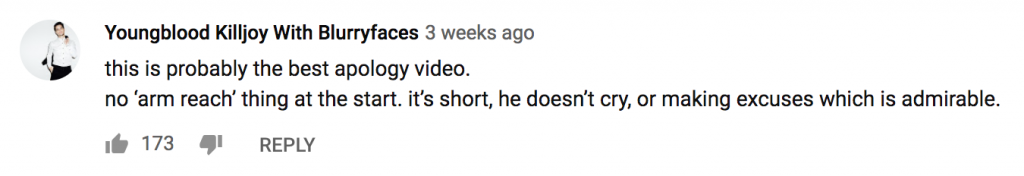 Looking at the comments, the recurring theme that succeeded was his approach, one that contradicts other apology videos, by being short and to-the-point. This was pointed out and agreed with by many in the comments section of the video: