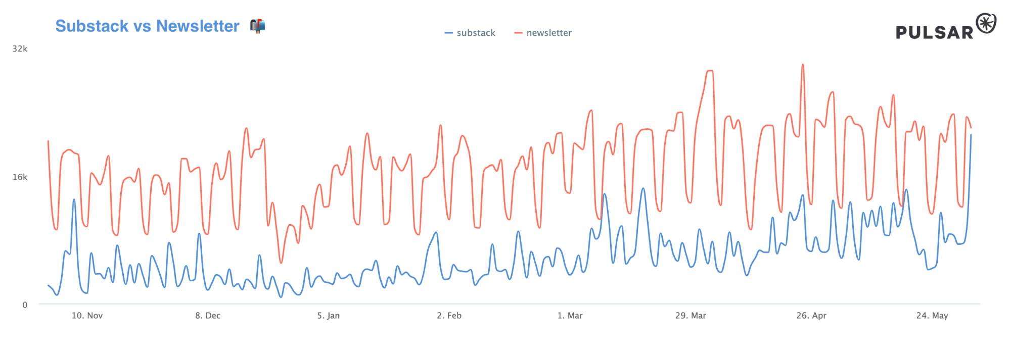 Newsletter platform Substack has been growing for a few years now, but over the past few months it has broken through to a new level, consistently racking up more than 10k mentions per day on Twitter, and touching peaks of more than 20k in the past few days.