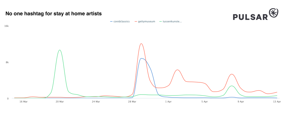 We therefore see peaks and sudden drop-offs in the use of #covidclassics, #tussenkunstenquarantaine and the more general #gettymuseum.
