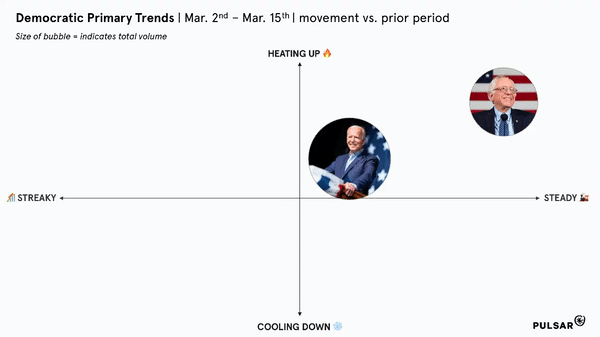 Just like at the polls, Biden overtook Sanders online by almost all of the metrics we were tracking, unseating what had been the undisputed leader over the past months. Â
