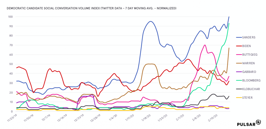 “Warren emerges as the clear winner of the Vegas debate, generating the most total buzz from February 19th-20th, the first time in 2020 we've seen any candidate drive conversation faster than Bernie. Our model suggests that this reversal of momentum could be her turning point moment,” said Marc Geffen, Pulsar's VP of Research & US Strategy.