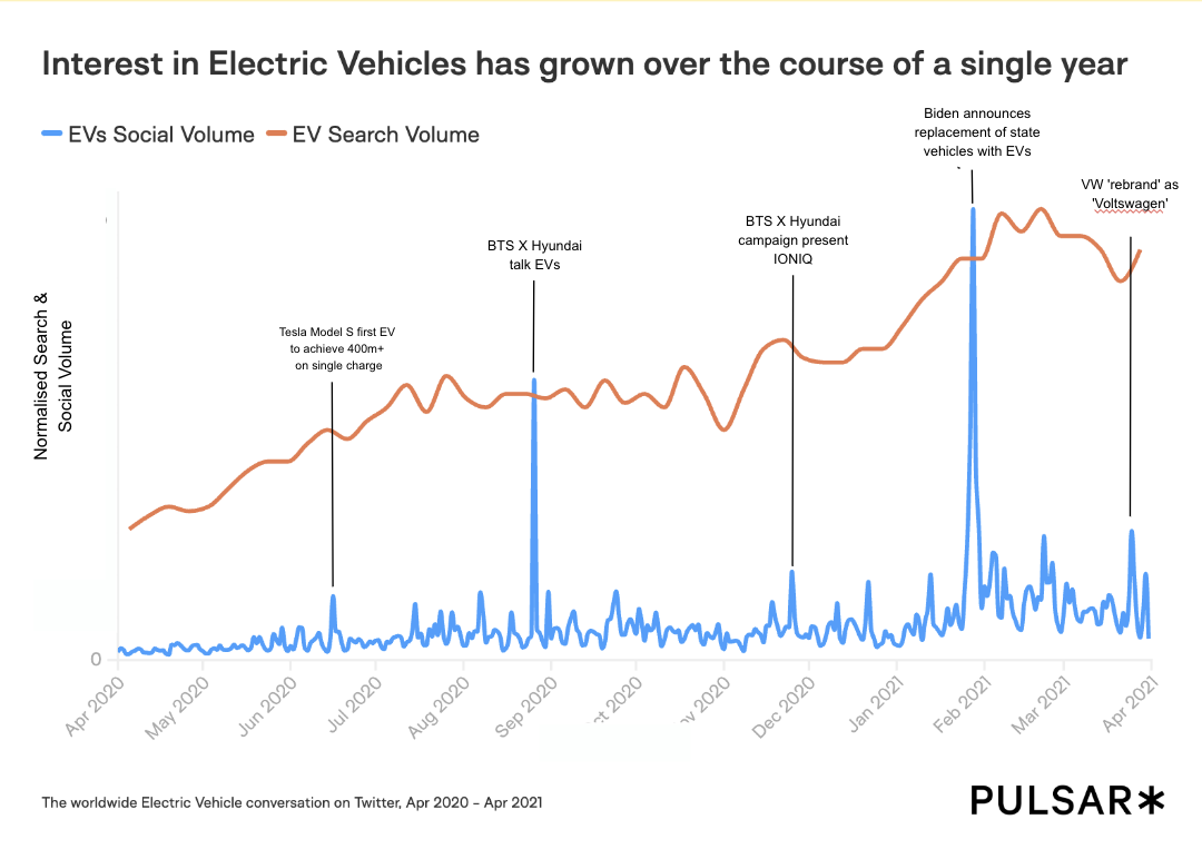 Online interest is also skyrocketing. Search interest in electric vehicles (EVs) has more than doubled over the past year, while social chatter has grown by a full 500% between Apr 2020 and Mar 2021.