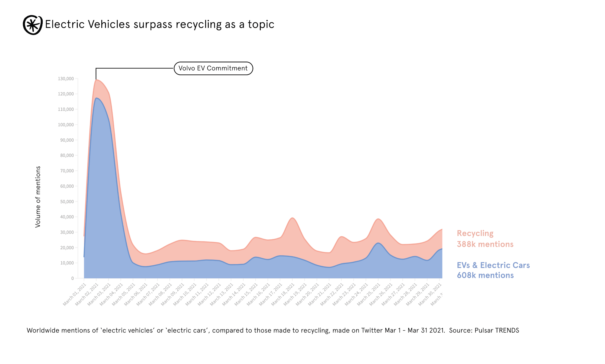 And, that same March, references to electric vehicles or cars were larger than recycling as a topic, with a general parity punctured by major EV events - in this case, Volvo's commitment to going fully electric by 2030.