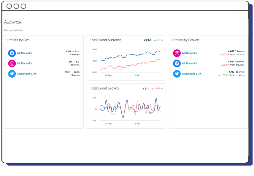 Explore your audience with Pulsar CORE. Get insights into your profiles by size within the selected period, total brand audience, total brand growth and your profiles by growth. Compare your progress to the previous period in an instant with a neatly packaged overview of your audience growth rate, from profile to profile.