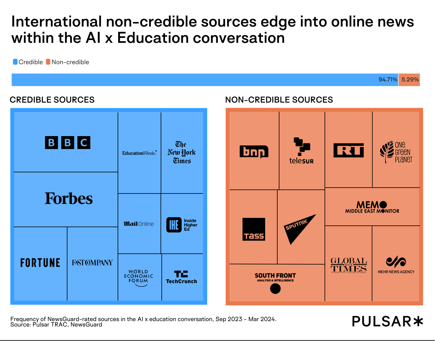 Now to get meta: there’s one more spanner in the works that has the chance to threaten the integrity of the conversation about education’s integrity. The prevalence of non-credible sources in the AI x education is high at over 5%. These non-credible sources are noted by reliability rating platform and Pulsar partner NewsGuard for being of high risk of spreading misinformation.